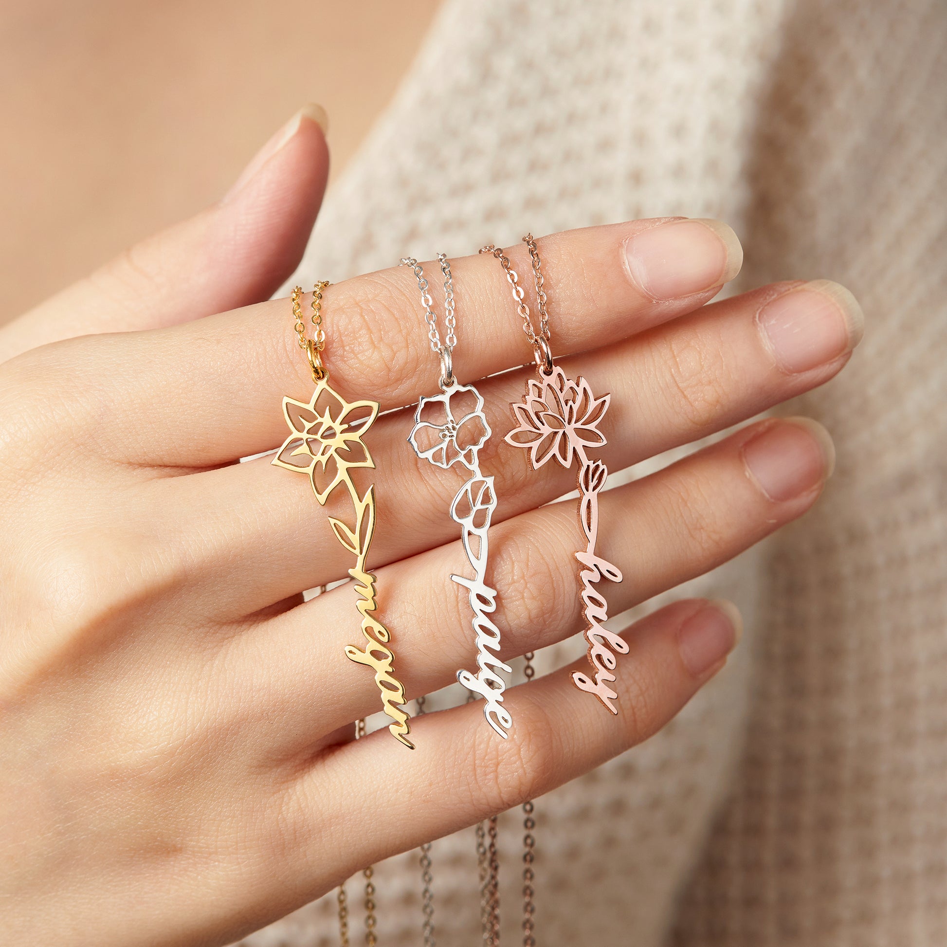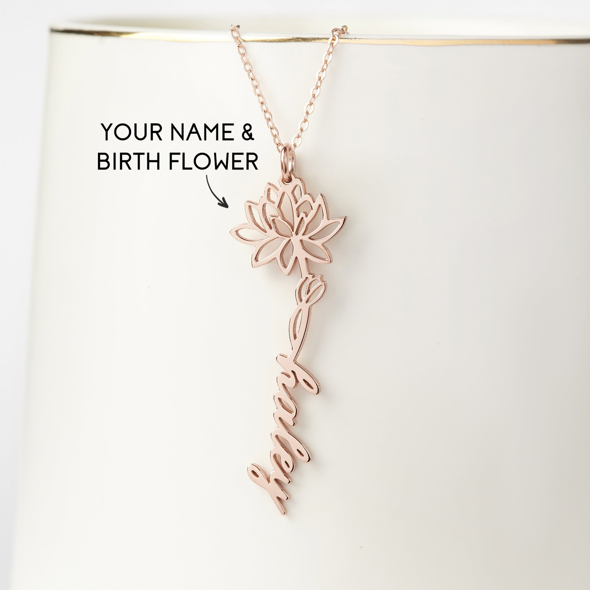 Birth Flower Name Necklace, Custom Name Jewelry, Floral Name Necklace