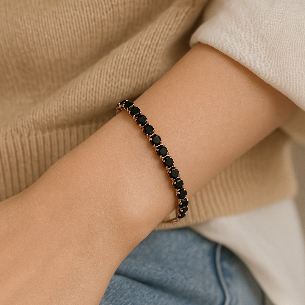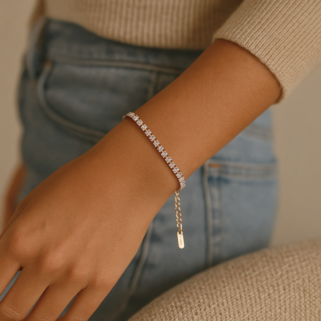 This stunning bracelet is designed for the modern lady, featuring a geometric design made with high-quality 304 stainless steel and 18K gold plating. Adorned with sparkling rhinestones, it adds a touch of elegance and sophistication to any outfit. Upgrade your accessory game with this sleek and timeless piece.