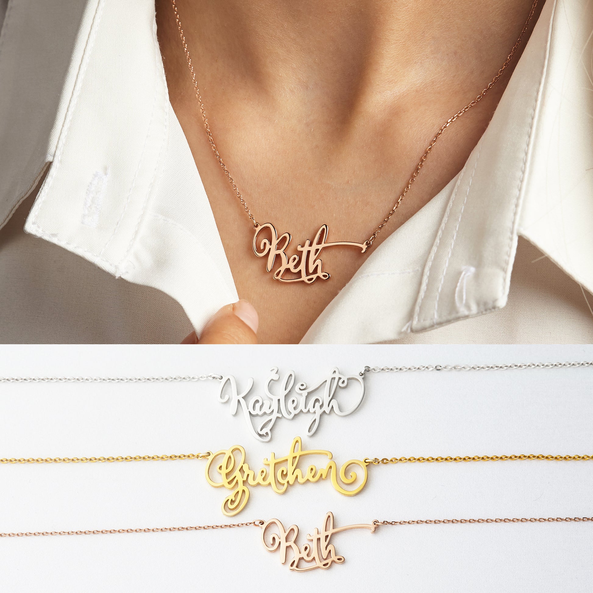 Boast your name in a handwriting font! This personalized name necklace is a cute way to wear your name. Great as gift for Christmas or birthday, this name necklace is available in sterling silver or 18K yellow or rose gold plated silver.
